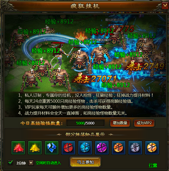 1:每天0点充值5000只高经验怪物,击杀可获得高额经验