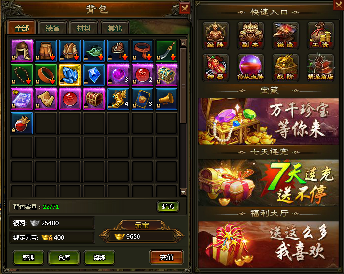 游戏中的背包可分为左右两块,左边为常见的背包功能块,包括道具展示、货币剩余以及整理背包、熔炼背包中装备、仓库快捷入口等功能按钮,右边为其他系统功能以及活动的快捷入口;