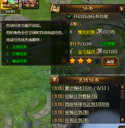 任务:分为主线任务、日常任务、帮派任务、支线任务