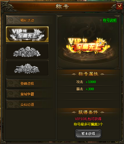 人物头上最多可以显示3个称号,所有激活的称号属性都可叠加,不受显示数量的影响;