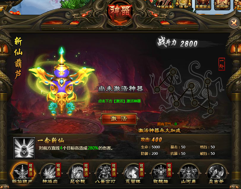 - 神器系统于23级开启,开启时可获得第一个神器----斩仙葫芦